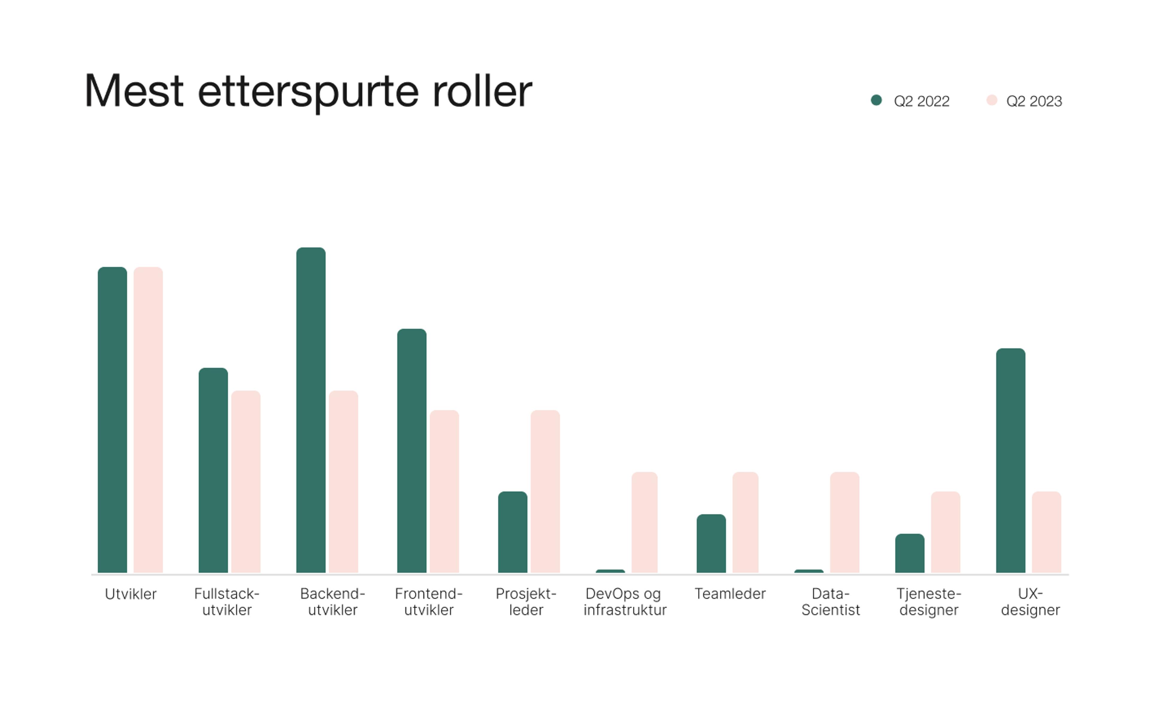 Roller innen teknologiutvikling har vært mest etterspurt dette kvartalet. -, - og utgjør en stor andel av de publiserte oppdragene. Volumet går riktignok noe tilbake sammenlignet med andre kvartal 2022 som samsvarer med den generelle utviklingen i oppdragsmengde.